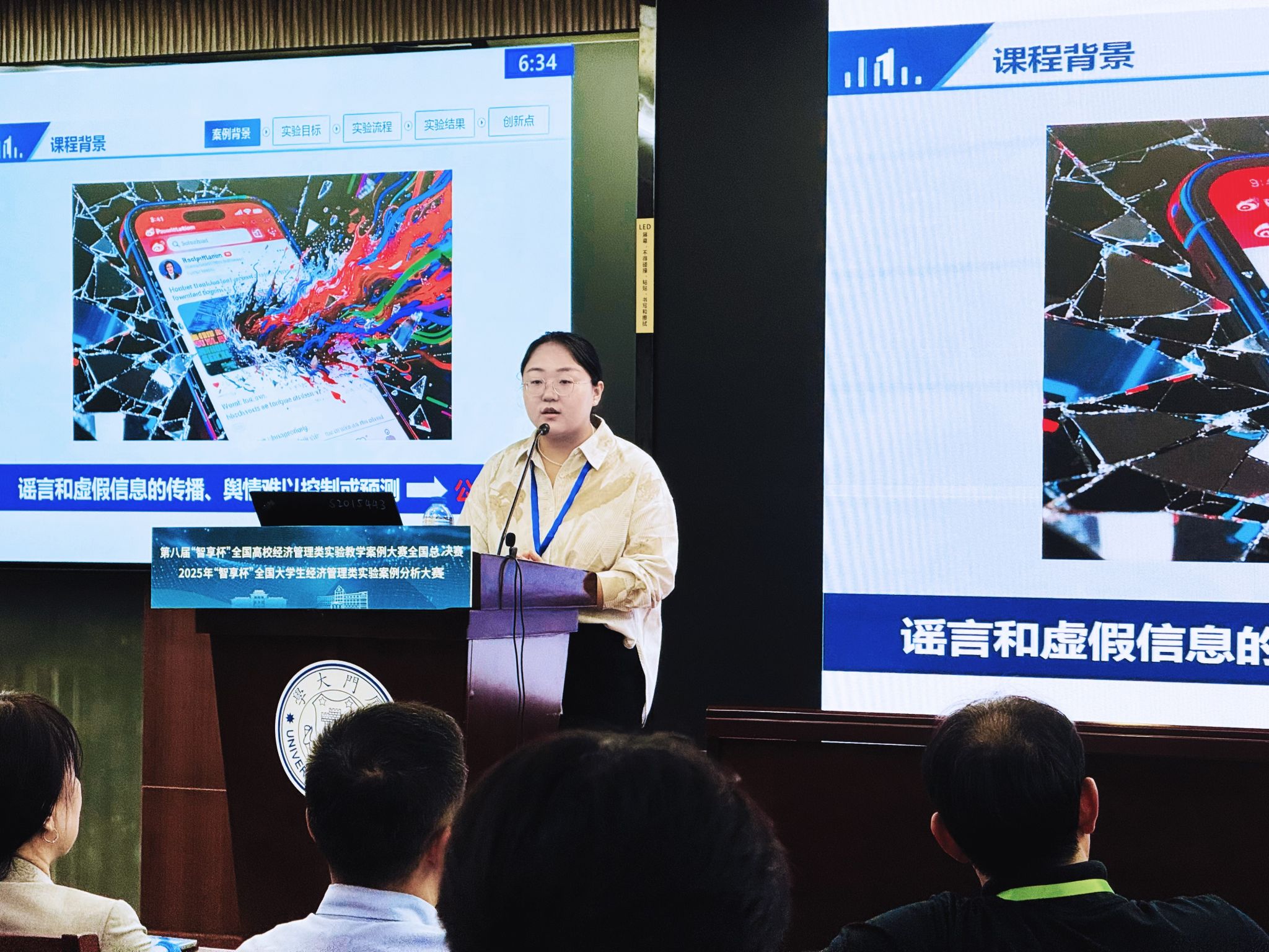 第八届“智享杯”全国高校经济管理类实验教学案例大赛全国总决赛面向教师,按照学科分成经济学科组与管理学科组两个组别,分三个赛场同时进行。我校4支教师参赛团队以华北赛区一等奖和二等奖的身份晋级全国总决赛,与西安交通大学、北京航空航天大学、厦门大学、电子科技大学、上海财经大学、中国矿业大学、合肥工业大学、中南财经政法大学等知名院校代表队同台竞技。经过激烈角逐,我校信息学院教师李毅、高敏团队的参赛案例“晋善晋美・智鉴舆情真伪:LLM-Agent仿真深度赋能社交媒体谣言识别与传播治理”(参赛答辩人高敏)荣获总决赛二等奖,其他3支参赛团队荣获总决赛三等奖,同时我校还获得高等学校国家级实验教学示范中心联席会颁发的优秀组织奖。